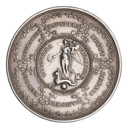 The obverse of this medal is imitated from a copper coin of Augustus. It commemorates Anson's defeat and capture of the French fleet off Cape Finisterre on 3 May 1747. The reverse, struck from two dies, records Anson's celebrated voyage around the world, from September 1740 to June 1744, during which he suffered many disasters, acheived some successes, and finally captured the Spanish galleon, the Nuestra Senora de Covadonga, with a treasure exceeding ?300,000. Names mentioned are those of the officers of his own ship, The Centurion. Officers: Admiral Sir Percy Brett, Vice-admiral Sir Peter Dennis, Vice-Admiral John Campbell, Admiral Viscount Augustus Keppel, Captain Philip Saumarez and Admiral Sir Charles Saunders. The medal was probably commissioned by Thomas Anson, George's older, bachelor brother, Whig M.P. and founder of the Society of Dilettanti, whose 'cabinet of medals' is referred to by Josiah Wedgewood. A variety has the correct but less commonly found spelling of 'Campbel' (this medal) on the reverse. Production accounts include the charge of ?80 for the dies, and the supply of fifty gold and eighty silver medals, the cost of each being ?l6 13s and 9s 10d respectively. Correspondence refers to forty medals having been struck in copper. Admiral of the fleet George Lord Anson was born in 1697. Entering the Royal Navy in 1712, he took part in the battle of Passaro in 1718 as Lieutenant, and became Captain in 1724. In 1737 he commissioned The Centurion, and when war broke out with Spain two years later Anson was made Commodore and given a small squadron for operations in the Pacific, but the death of men prevented his sailing until September 1740. Dispersed by a heavy gale off Cape Horn, The Centurion reached Juan Fernandez in June 1741, with only two ships in company.^^Ex Philip Benjamin Collection.