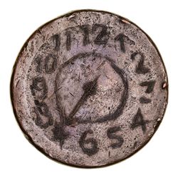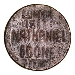 CONVICT LOVE TOKEN, engraved on a 1797 cartwheel penny shaved smooth on both sides, on one side is engraved, "London/1811/Nathaniel/Boone/7 Years", and on the other side is engraved a clock with the single hand pointing to 4. Very good.