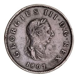 CONVICT LOVE TOKEN, on a George III 1807 halfpenny with reverse shaved smooth, on the reverse side is engraved, "Wm/Lynch/1818". Minor edge nicks, otherwise good fine.