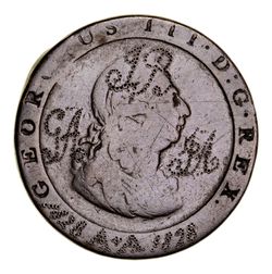 CONVICT LOVE TOKEN, engraved on a 1797 cartwheel penny with the reverse shaved smooth, obverse stipple engraved, "IB/GA/IA/1828 A.A1828", the reverse stipple engraved, "When/This you see/Remember me/although I at A/distance be/IA", with some decorative work. Large edge nick on reverse, otherwise fine.