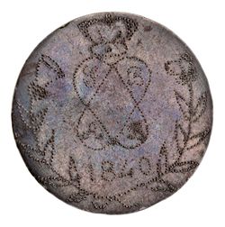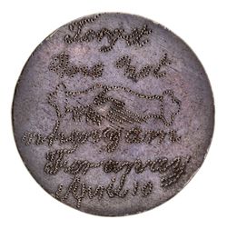 CONVICT LOVE TOKEN, on a George III halfpenny shaved smooth on both sides, stipple engraved on one side, "Forget/me not/(a pair of hands shaking)/when I am/Far away/April 10", and on the other side, a heart above two crossed oval slabs bearing the initials, "GB" at the top and "AB" at the bottom, and below this is the date 1840 with a wreath of leaves and flowers around the edge. Fine.