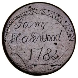 LOVE TOKEN, smoothed halfpenny, barque on water engraved on obverse, reverse engraved 'Jams Halewood 1783'. ...