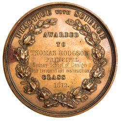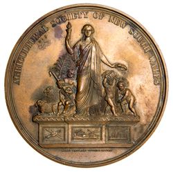 AGRICULTURAL SOCIETY OF NEW SOUTH WALES, in bronze (88mm) by Hardy Brothers, inscribed on reverse Awarded To 'Thomas Hodgson/Principal/Sydney School of Design/For Efficient Art Instruction/1872'. Some staining, otherwise good very fine.