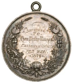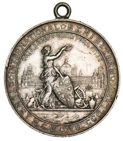 SYDNEY INTERNATIONAL EXHIBITION, NSW, 1879, in silver (51mm), by J.S. & A.B.Wyon, features a figure of New South Wales standing holding a wreath and the colonial shield surrounded by exhibition goods and behind is a view of the Sydney Garden Palace Exhibition Building, on the reverse is an open wreath of flowers and the recipient's name and award, inscribed to, "Awarded/To/Hon Philip Russell/Carngham Victoria/For Wool/1879", with suspension loop fitted to edge. Edge nick, hairlines and contact marks, otherwise very fine.