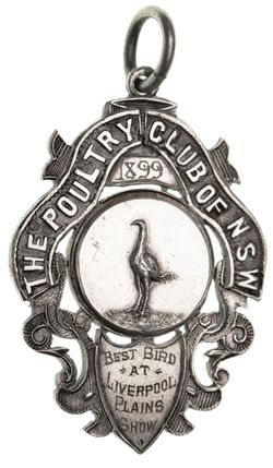 THE POULTRY CLUB OF N.S.W, fob award in voided silver (28x38mm), with ring top suspension, obverse inscribed, "1899/Best Bird/At/Liverpool/Plains/Show". Very fine.