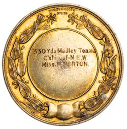 WOMEN'S AMATEUR SWIMMING ASSOCIATION NEW SOUTH WALES, by Angus & Coote, in silver (44mm), various races all awarded to Miss P. Norton, two undated, others dated 8.1.38 (2), 21.1.39, 25.3.39, 9.30.40, 30.3.40; Queensland Ladies' Amateur Swimming Assn Championships, in silver (44mm), by Wallace Bishop, reverse inscribed '200 metres/ Freestyle/ Season 1939-40/ P. Norton'. Toning, very fine. (9)