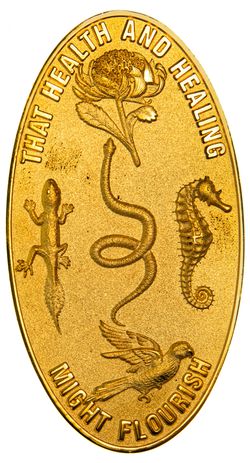 THE SURGEON JOHN WHITE MEDAL, an oval medal in gilt (49x90mm), designed by Major General John Pearn AM, RFD, obverse depicts five examples of Australian flora and fauna identified by John White and includes a waratah, a southern leaf-tailed gecko, a red-bellied black snake, White's seahorse and a blue-bellied parrot, the snake being a symbol of medicine and the waratah is the state emblem of NSW, with the legend, "That Health And Healing/Might Flourish"; reverse bears the inscription, "The/Surgeon-General/John White/ Medal/For Service To/Health/In Its/Many Forms", unnamed. In damaged fitted case of issue, a few surface marks and some edge nicks, otherwise uncirculated and scarce.