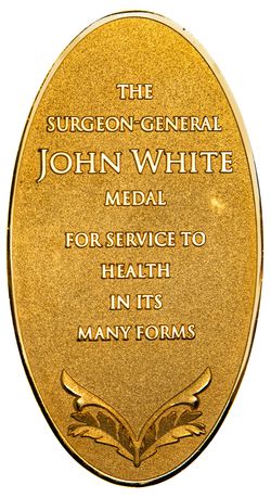 The Surgeon John White Medal is a commemorative medal in honour of the first Surgeon-General in Australia and Chief Surgeon of the First Fleet in 1788. It was designed by Major General John Pearn AM, RFD and features some Australian flora and fauna identified by Surgeon John White and is awarded for outstanding service in Australian health services including Australian Defence Force Health Services. One notable recipient in 2007, the first year it was issued, was the Immediate Past Surgeon-General Air Vice-Marshall Bruce Short AM, RFD.