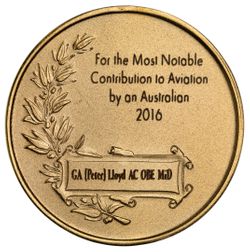 Peter Lloyd had previously been awarded the same medal in 1969, and is one of only three Australians to have received the Federation Aeronautique Internationale (FAI) gold medal.^^The 2016 medal was awarded for his unabated enthusiam for air safety and his contributions to Safeskies, and his youthful energy towards the betterment of the aviation industry despite no longer flying.
