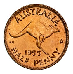 ELIZABETH II, Perth mint proof halfpenny, 1955. Full red, FDC and rare.