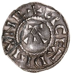 VIKING COINAGE OF DANISH EAST ANGLIA, (885 - 915 AD), St Edmund memorial coinage, silver penny, (1.53 g), moneyer Odulbert (S.960, N.483). Professionaly repaired, very fine, scarce.