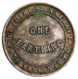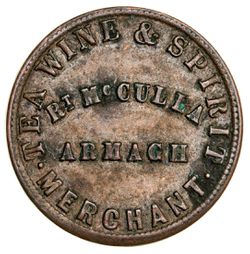 UNOFFICIAL FARTHINGS, Ireland, (1820-1901) listed with Withers numbers, Co. Armagh, Armagh, 5310 (Rt. McCulla) RR; Co Down, Ballymacarrett, 5340a (2 var); Co Antrim, Belfast, 5360, 70, 80a, 83, 90 (John Arnott and Co) (5); 5400 (Ferrar and Co); 5410 (Ferrar and Taggart); 5430 (W. Foster); 5460 (B. Hughes); 5510, 20, 25 (C.P. McGlade) (3); 5533 (McKenzie Bros.) (2); 5545, 49, 53 (Robert McKenzie); 5560, 67 (Mackenzie and McMullen) (2); 5580 (Robertson Bros.) RR; Tipperary, Clonmel, 5620 (McSwiney, O'Brien and Co) RR; Londonderry, Coleraine, 5640 (Robert Small); Co Cork, Cork 5660 (Arnott and Co); 5680a (George S. Beale); 5690a (Newport Coal Stores); 5700 (J.C. and Co, late Todd and Co), 5710 (E. Cleburne); 5720 (Cork Down Office); 5730, 5740c (Wm Fitzgibbon) (2); 5750a (Denis Hegarty); 5760 (Joseph Helen); 5790 (E.D. Mahony); 5830 (John O'Donoghue); 5840 (Ogilvie and Bird); 5850 (William Reardon), Cove, 5910 (Swanton and Co). Very fine or better. (41)