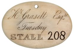 HER MAJESTY'S THEATRE AND OPERA HOUSE, ivory tickets in oval shape (50x38mm), 1840 rev. 'H. Grosett Esq./Tuesday/Stall 208'; 1842 T.G. Pole oblong with rounded ends rev. 'Mifs E. Bryan/Pitbox 16/1' (cf Withers 333 and 332), another similar oblong (50x29mm) 1847 rev. 'Mrs. Sandford/Saturday/Box 16/4'. Pierced as usual, very fine or better and rare. (3)