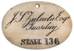 HER MAJESTY'S THEATRE AND OPERA HOUSE, ivory tickets, all oval (50x35mm), 1851 rev. 'J.L. Zulwela Esq./Thursday/Stall 136'; another rev. 'Wm Wells Esq./Tuesday and Thursday/Pitbox R/4'; 1856 rev. 'Mrs. Phillips/Box 69 1/2 /5' (cf Withers 340, 1, 3). Good very fine. (3)