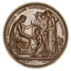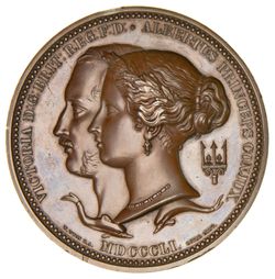 GREAT INTERNATIONAL EXHIBITION, 1851, London (76mm), by W.Wyon, Leonard C. Wyon and Royal Mint, London, conjoined heads of Prince Albert and Queen Victoria left with two dolphins below and the date MDCCCCLI, reverse, Britannia seated crowning a kneeling figure of Industry with laurel, Europa, Asia, Africa and America attending, with the legend DISSOCIATA LOCIS CONCORDI PACE LIGAVIT (It has bound together in peace and friendship things widely separated), edge impressed, "Prize Medal Of The Exhibition" and "Duke & Son. Class XXIX.", in case of issue. A few edge nicks, otherwise extremely fine.