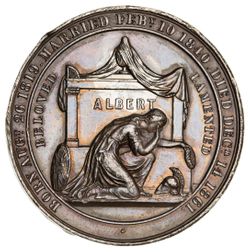 DEATH OF THE PRINCE CONSORT, 1861, in white metal (45mm) (BHM 2697), by J.Moore, obverse, bare head of Prince Consort left, reverse, Britannia kneeling and weeping before the veiled tomb inscribed ALBERT and at the sides, BELOVED/LAMENTED. Edge nicks and dark toned, otherwise very fine.