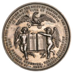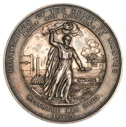 BICENTENARY OF THE REVOCATION OF THE EDICT OF NANTES, commemorated by the Huguenot churches in London, 1885, silver (47mm), obv. robed figure holding dagger and torch, and instruments of torture, rev. two cherubs supporting a bible, (BHM 3192A, volume 3, p.266). This is the actual specimen illustrated in BHM, extremely fine and rare.