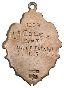 EAST LONDON FOOTBALL CLUB, fob medal, in silver and gold, (33 x 40 mm), reverse inscribed '1909 / L.F. Cole / CapT. / Millfields Rd. / E.S'. Toning, very fine.