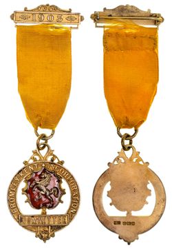 SILVER MEDALS, pins, and fobs, Bromley-Kent Incoporation Medal, gilt silver complete with ribbon and suspension bar (21.06 g); Licensed Victualler's School, Slough, 1935 silver Jubilee medal (21.25 g); London College of Teachers, Honours Award Medal (10.78 g); West London Band of Hopie Union, Choir medal, 1909, to Eily Gulling (7.64 g); University of Glasgow, McColl Society silver badge (9.92 g); Addenbrooke's Hospital, Senion Nurse badge (12.32 g); National Society of the American Revolution, History Award, with ribbon and suspension bar and original presentation box (12.87 g). Fine - uncirculated. (7)