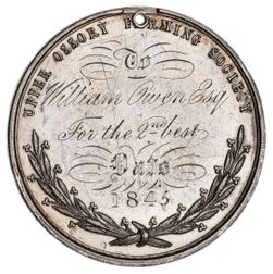 IRELAND, Upper Ossory Farming Society, in silver (43mm) by J. Parkes, "To/William Owen Esq/for the 2nd Best/Oats/1845". Pierced at top, surface marks otherwise very fine.