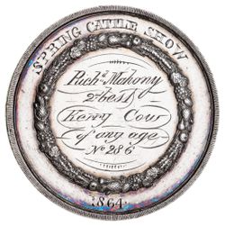 IRELAND, Royal Dublin Society, Prize Medal in silver (44mm) by W. Woodhouse, Spring Cattle Show 1864 "Richard Mahony/2nd last/Kerry Cow/of any age/No 286". Rubbed, otherwise extremely fine.