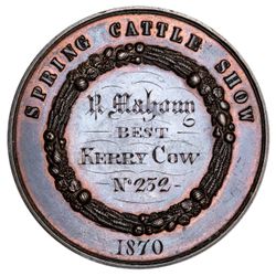 PRIZE MEDAL ROYAL DUBLIN SOCIETY, Spring Cattle Show, 1870 in bronze (51mm), 'R.Mahony/Best/Kerry Cow/N.232'. Extremely fine.