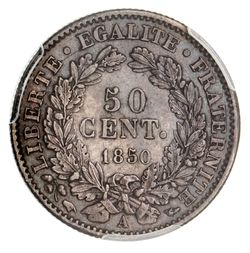 FRANCE, Second Republic, silver fifty centimes, 1850 A (KM.769). Dark toned, nearly uncirculated.