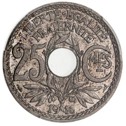FRANCE, Third Republic, twenty five centimes, 1916, dash under MES type (KM.867). Uncirculated.
