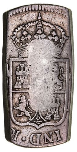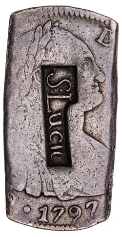 SAINT LUCIA, 6 Livres 15 Sols of 1813, made as a cut segment from a Spanish dollar of 1797 with obverse countermarked S:Lucie in relief within shaped indent, the cut edges are plain, (15.11 grams), (Pr.9 [same punch], Gordon Collection [Baldwin's Auctions] Sale 8 lot 104 [same punch]). The host coin fine, countermark very fine and very rare.