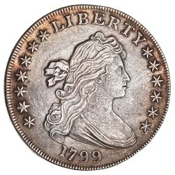 USA, DRAPED BUST, silver dollar, 1799, normal date, 13 star reverse (KM.32). Surface roughness, lightly toned, nearly extremely fine.