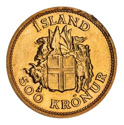 ICELAND, 500 kronur, 1961 (KM.14). Ex mount otherwise extremely fine.