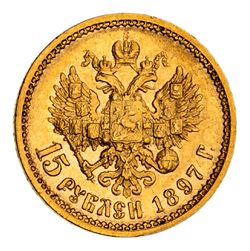 RUSSIA, Nicholas II, fifteen roubles, 1897 (KM.Y.65). Nearly extremely fine.
