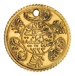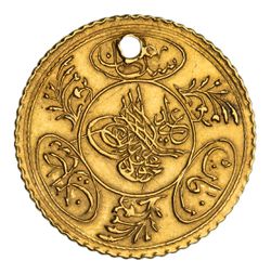 TURKEY, Mahmud II, 1/ 4 altin, Constantinople Mint, AH 1223/? (KM.627). Holed with loop ring ...
