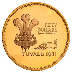 TUVALU, Constitutional Monarchy, proof 50 dollars, 1981, Royal Wedding (KM 14). In Royal Mint case of issue, FDC.