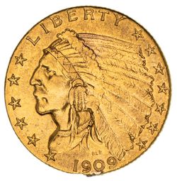 USA, TWO AND A HALF DOLLARS OR QUARTER EAGLE, 1909, Indian head. Mount removed from top of reverse, otherwise good very fine.