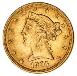 USA, FIVE DOLLARS OR HALF EAGLE, 1907, Liberty head. Lightly toned, nearly uncirculated.