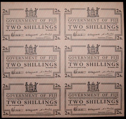 FIJI, Government of Fiji, 1942 emergency issue, two shillings, uncut block of six (P.50r2). Good extremely fine.