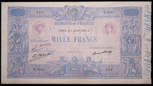 FRANCE, Republic, Bank of France, one thousand francs, 7.7.26, 520/K.2521; 63009520 (P.67k; F.36.43). Light centrefold, pin holes lower right otherwise very fine or better and scarce.