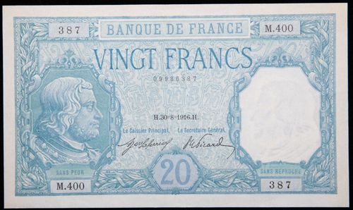 FRANCE, Republic, Bank of France, twenty francs, 30.8.16, M.400/387; 09986387 (P.74; F.11.1). Two fine pinholes, ...
