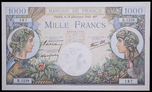 FRANCE, Republic, Bank of France, one thousand francs, 26.1.39, 107/G.5790; 144731107 (P.90c; F.38.33); 19.12.40, 187/B.1239; ...
