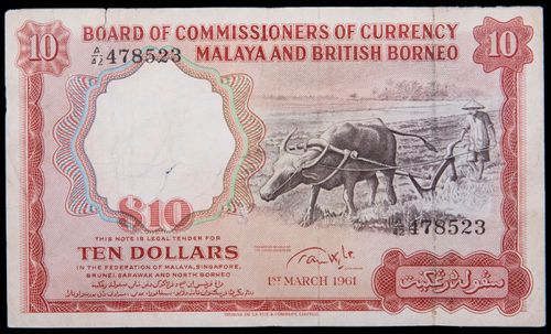 MALAYA AND BRITISH BORNEO, ten dollars, 1st March 1961 A/42 478523 (P.9a). Top left tear, otherwise good fine.