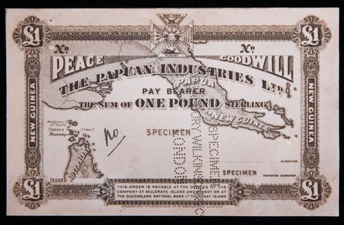 PAPUA NEW GUINEA, The Papuan Industries Ltd., printer's sepia print photo of BW&Co specimen one pound (1906), inked answer 'No' (Mira P49). Pin holes top left corner otherwise extremely fine.