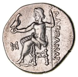 MACEDON, Kingdom of, Alexander III, (336- 323 B.C.), silver drachm (4.04 g), Abydos Mint, struck c.310-01 B.C., obv. head of Herakles right, wearing lionskin headdress, rev. Zeus seated left, legs crossed, holding eagle in right hand, MY monogram in left field, I (archaic Z) beneath chair, **ALEXANDROU* to right (Price 1828, SNG Cop 994). Bright, light golden toning in recesses, nearly extremely fine.
