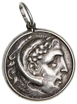 MACEDON, Kingdom of, Alexander III, (336-323 B.C.), silver tetradrachm, (16.92 g), Rhodes Mint, Ainetor Magistrate, issued c.201-190 B.C., obv. head of Herakles to right wearing lion skin with dotted border, rev. Zeus seated on throne to left, eagle in outstretched hand, **ALEXANDROU* to right, **AINHTWR* to left over rose, P O under throne, dotted border, (cf.S.6713, Price 2518, BMC 2518, Ashton 251, Kleiner Rhodes, Series XIII, HGC 6, 1455, M.1160, SNG Cop. 762). Toned, nearly extremely fine and a rare type, mounted in a surround suspension mount.