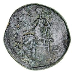 MACEDONIA, Amphipolis, Septimius Severus, (193-211 AD), bronze unit (AE22, 7.87g), obv. laureate head right, rev. Tyche enthroned, facing left, holding a patera, star to left, AMPH before (Moushmov 6014; Varbanov 3268; BMC 122). Punch mark on obverse, green patina, nearly very fine.