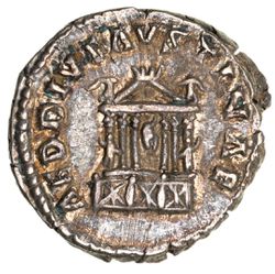 FAUSTINA SENIOR, wife of Antoninus Pius, (died A.D. 141), silver denarius, Rome Mint, issued in 150, (3.16 g), obv. DIVA FAVSTINA, draped bust to right, rev. AED DIV FAVSTINAE, front view of temple of six columns, low wall before, figure (Faustina) seated within, ornaments on temple, (S.4573, RIC 343, RSC 1). Lightly toned, good very fine.