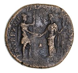 COMMODUS, (A.D. 177-192), orichalcum sestertius, (24.31g), Rome mint, issued 192 AD, obv. laureate head right, L AEL AVREL COMM AVG P FEL rev. Roma, helmeted and draped, standing right, holding spear and clasping hands wth Fides, standing left, holding standard, star in field, PM TR P XVII IMP VIII COS VII P P S C; Julia Domna, (193-211 AD), bronze dupondius (10.54g), Rome mint, obv. bust of Julia Domna right, IVLIA AVGVSTA rev. Ceres, draped, seated left holding corn ears and torch, CERES SC (RIC IV 870). Nearly very fine; fine/good. (2)
