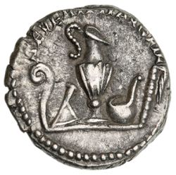 GETA, (A.D. 209-212), silver denarius, issued 199-200, Laodicea Mint, (2.92 g), obv. laureate bust to right, around P SEPTIMIVS GETA CAES, rev. SEVERI PII AVG FIL, lituus, knife, jug, simpulum and sprinkler, (S.7201, RIC 107, RSC 189, BMC 754). Nearly extremely fine/good very fine, scarce.