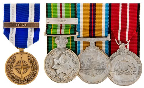 Together with matching sets of court mounted miniatures, set of 5 and set of 3, no NATO Medal with clasp ICAT; Australian Army Ordnance Corps hat badge (QC); Army Combat badge.^Ex JB Military Antiques 21/02/2013.^Warrant Officer Class One Russell Bevington was born at Walsall, England on 15 February 1971. He enlisted in the British Army on 5 January 1988. Upon completion of training at the Junior Leaders Regiment in Bovington he was allocated to the Royal Army Pay Corps where he completed his initial corps and employment training. He was then posted to 2nd Field Regiment Royal Artillery in Germany. After a two year posting he was promoted to Corporal and served a six month operational tour with the United Nations in Cyprus. In 1991 he was posted to the Light Division Depot in Winchester as both a section commander recruit instructor and as an initial employment training instructor. In October 1993 he was promoted to Sergeant and posted as part of the Northern Ireland Training Team in County Antrim, Northern Ireland.^In 1995 he was posted to 36 Engineer Regiment in Maidstone and during his tenure he was deployed to Bosnia in 1996 as part of the NATO Implementation Force. Then in 1997 he was posted to The Light Dragoons in Germany and during this posting he completed a second operational tour in Bosnia. In January 2000 he was promoted to Staff Sergeant and posted to Army Training Regiment in Winchester as a recruit platoon commander. He was promoted to Warrant Officer Class Two in January 2002.^On 10 March 2003 he transferred to the Australian Regular Army. After a brief period at 1st/15th Royal New South Wales Lancers he was posted to the Army Recruit Training Centre at Kapooka as a Platoon Sergeant. After two years he assumed the position of the Training Warrant Officer within the Training and Assessment Cell and was promoted to Warrant Officer Class II on 1 July 2006. He was awarded a Commandant's Commendation for his work as a recruit instructor.^In January 2007 he was posted to the 1st Combat Service Support Battalion in the role of Company Sergeant Major. In early 2008 he was selected to be Company Sergeant Major of the Combat Service Support Team that deployed to Afghanistan as part of the 1st Mentoring and Reconstruction Task Force. In January 2010 he was posted to the 1st Aviation Regiment as Squadron Sergeant Major. He was promoted to Warrant Officer Class One in January 2012 and appointed Regimental Sergeant Major of 13 Combat Support Battalion.^With research.