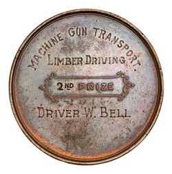 PRIZE MEDAL, in bronze (44mm), Imperial School of Instruction Zeitoun 1918, obverse inscribed, "Machine Gun Transport./Limber Driving/2nd (Prize)/Driver W. Bell". Appears to be blue tack residue on reverse, otherwise very fine.